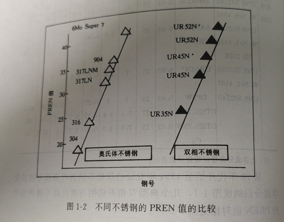 從70年代開(kāi)始至1994年發(fā)展的雙相不銹鋼代表牌號(hào)按其化學(xué)成分歸納成圖1-1,幾個(gè)典型雙相不銹鋼與奧氏體不銹鋼相關(guān)的PREN值對(duì)比見(jiàn)圖1-2.